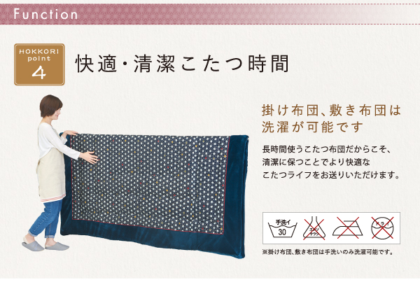 長時間使うこたつ布団だからこそ、清潔に保つことでより快適なこたつライフをお送りいただけます。