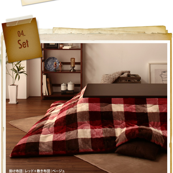 赤みがかった明るめのブラウンと、鮮やか過ぎないレッドの組み合わせ。木のぬくもりを感じるこたつテーブルにピッタリ。