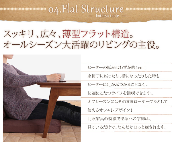 ヒーターの厚みはわずか約4cm!座椅子に座ったり、横になったりした時もヒーターに足がぶつかることなく、快適にこたつライフを満喫できます。