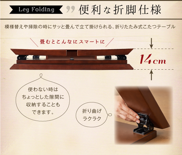 模様替えや掃除の時にサッと畳んで立てかけられる、折りたたみ式こたつテーブル。