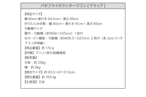 右オープン棚部:可動棚(約W26.5×D27㎝)2枚付(各3㎝ピッチで3ヶ所移動)
