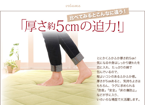 厚さが5cmあると、気持ち良さはもちろん、ラグに求められる「防音」「安全」「床の傷防止」などが手に入り、いろいろな場面で大活躍します。