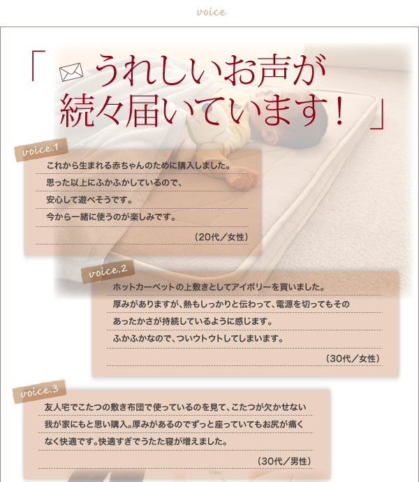 ・友人宅でこたつの敷き布団で使っているのを見て、こたつが欠かせない我が家にもと思い購入。厚みがあるのでずっと座っていてもお尻が痛くなく快適です。快適すぎでうたた寝が増えました。(30代/男性)