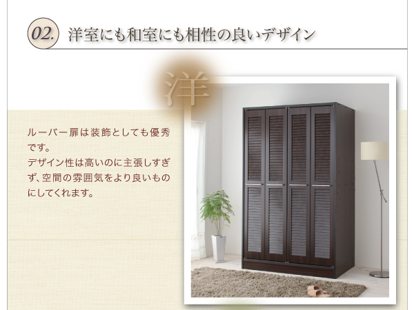 通気性の良いルーバー扉を使用。ふとんや衣類を湿気やカビから守ってくれ、気になるホコリも防ぎます。デザイン性にも優れており、洋室にも和室にもなじみます。